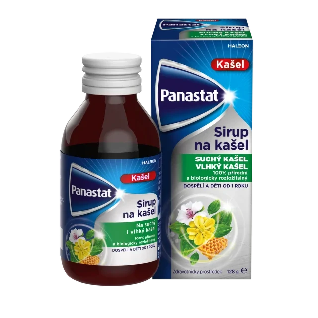 Panastat sirup je zdravotnický prostředek určený k úlevě od suchého i vlhkého kašle a k ochraně sliznic horních cest dýchacích. Obsahuje účinnou kombinaci tří bylin – jitrocele kopinatého, proskurníku lékařského a řepíku lékařského – obohacenou o med. Tyto přírodní složky vytvářejí na sliznici ochranný film, který ji zvlhčuje, podporuje uvolňování a vykašlávání hlenu a přispívá k jejímu zklidnění. Sirup navíc působí antioxidačně, čímž pomáhá chránit sliznice před podrážděním způsobeným volnými radikály.