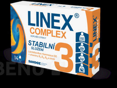 LINEX Complex je doplněk stravy, který obsahuje lyofilizované bakterie Lactobacillus rhamnosus GG, vitaminy B1, B2, B6 a zinek.