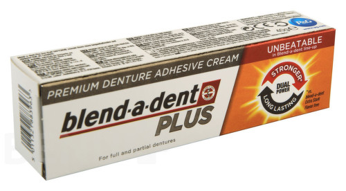 Blend-a-dent Plus Dual Power je fixační krém bez příchuti, který zvyšuje stabilitu zubní náhrady a posiluje sílu skusu až o 63%. Krém zabraňuje pronikání zbytků jídla pod zubní náhradu a ochraňuje sliznici před mechanickým poraněním zubní náhradou. Poskytuje zubní náhradě stabilitu po celý den.