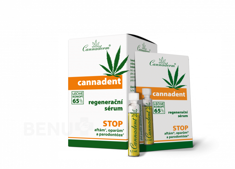 Cannadent regenerační sérum je určený pro přímou péči o rty a sliznice úst. Patentově chráněná receptura s antimikrobiálním účinkem. * sérum je kosmetický přípravek, který urychluje regeneraci tkání a přispívá ke zmírnění pocitů pálení, svědění, pnutí a nadměrné citlivosti rtů a sliznice úst spojených s výskytem aft, oparů, parodontózy a u otlaků od protéz a rovnátek.